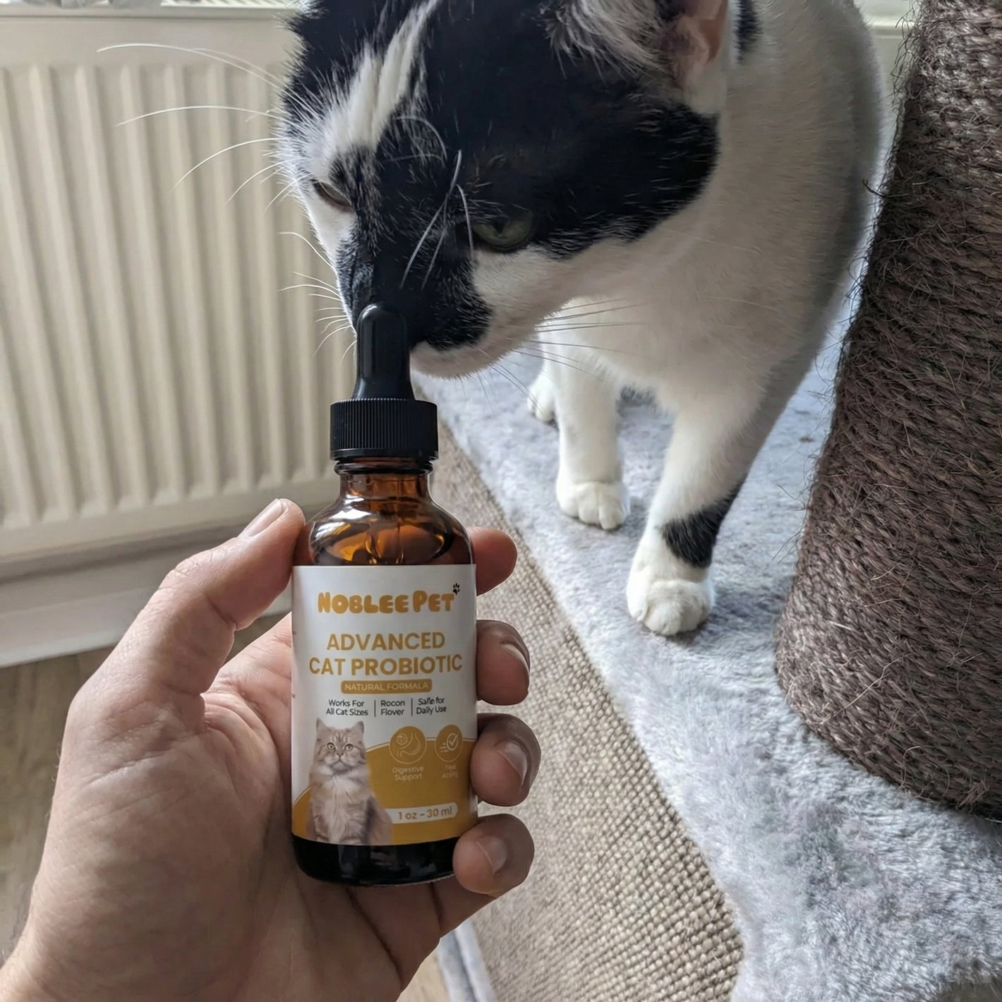 Most probiotics only focus on "poop." NobleePet is an Advanced Probiotic Complex designed to fix both digestion and behavior. Unlike messy powders, our liquid dropper allows for precision dosing and faster absorption into the bloodstream. It is also specifically recommended by cat behaviorists for its mood-stabilizing effects.